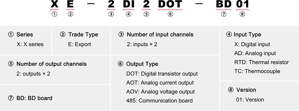 | 2 | XE-4AI-BDO1 | 4AI, 15-bits huidig type | analoge stroomingangen ×4 |