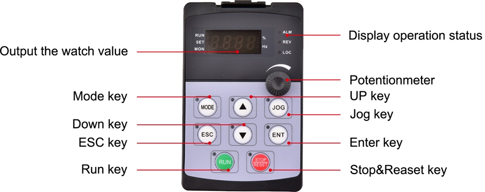 | Frequentie-instellingssignaal | Geïntegreerd bedieningspaneel | Membraanschakelaar (knop), snelheidsknop (potentiometer) |