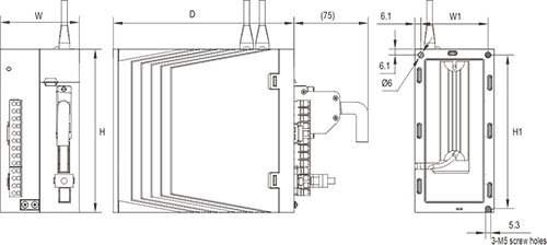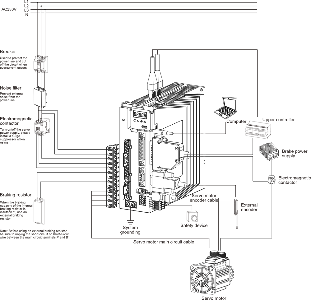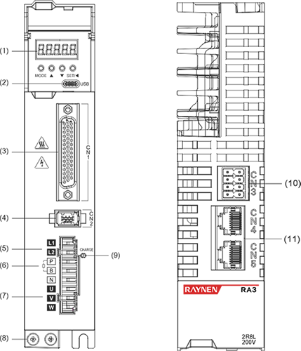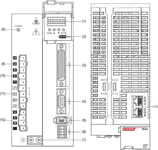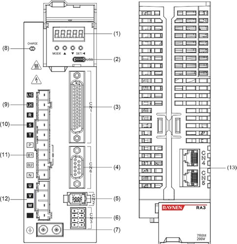 | Beschrijving: ① Digitaal buisdisplay: 5-cijferige LED-digitale buis met 8 segmenten ②USB: USB Type-C-interface, aangesloten op pc ③CN1 (interfaceconnector): uitgangs-/ingangssignaalverbindingspoort, aangesloten op programmeerbare controller (PLC) of besturings-I/O ④Volledig gesloten lus encoderconnector: volledig gesloten lusinterface, aangesloten op externe tweede encoder, '-FS'-model ondersteunt deze functie ⑤CN2 (encoderconnector): encoderinterface, aangesloten op de encoder op de servomotor ⑥L1, L2, L3 (hoofdvoedingsingangsklemmen): voeding van het hoofdcircuit, eenfasige voeding is aangesloten tussen L1 en L2 (voeding 200 ~ 240VAC, 50/60Hz) ⑦L1C, L2C (elektronica voor stuurstroomingang): voeding stuurcircuit, aangesloten op eenfasige voeding (200~240VAC of 380~440VAC, 50/60Hz voeding volgens het model) ⑧R, S, T (hoofdvoedingsingangsterminals): Voeding hoofdcircuit, aansluiten op driefasige voeding (200~240VAC of 380~440VAC, 50/60Hz voeding volgens het model) ⑨P, B (aansluitklem externe remweerstand): gebruik een externe remweerstand ⑩P, B1, B2 (aansluitklem externe remweerstand): gebruik een externe remweerstand (verwijder het kortsluitstuk tussen P en B1, sluit aan op beide uiteinden van P en B2) ⑪P, N (N1, N2) (servobusterminal): verwijder het kortsluitstuk tussen N1 en N2 niet, sluit aan tussen P en N (N1) voor meerdere servo's om de DC-bus te delen ⑫N1, N2: sluit externe DC-reactor aan (verwijder het kortsluitstuk), kortsluiting wanneer niet in gebruik ⑬U, V, W, PE (aansluitklem servomotor): uitgang servoaandrijving, aangesloten op de motorvoedingsconnector (U, V, W, PE) ⑭ Aardingsschroef: Sluit aan op de stroom- en motoraarde ⑮CHARGE (busspanningsindicator): voedingsindicator ⑰CN3 (connector voor veiligheidsfunctie): STO-interface, alleen '-S/FS'-modellen ondersteunen deze functie ⑱CN4/CN5 (communicatieterminal): 485 communicatiepoort, EtherCAT hogesnelheidscommunicatiepoort, CAN-communicatiepoort | |||||||||