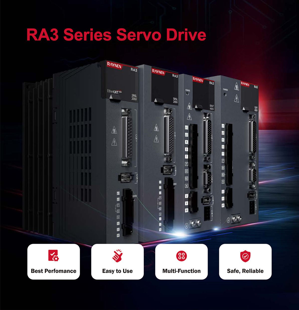 | Vermogensbereik van 100W tot 7,5KW Ondersteunt puls, analoog, EtherCAT en CANopen | |
